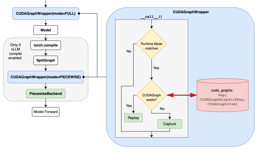 The above steps are based on the assumption that the CUDA Graphs wrapper would directly trust what’s in the forward context (controlled by the dispatcher). This lets us simplify and centralize the logic, reducing the complexity as well as the risk of mismatched state between the wrappers and the dispatcher. It also allows reusing the wrapper class for both FULL and PIECEWISE runtime modes. See the implementation here.